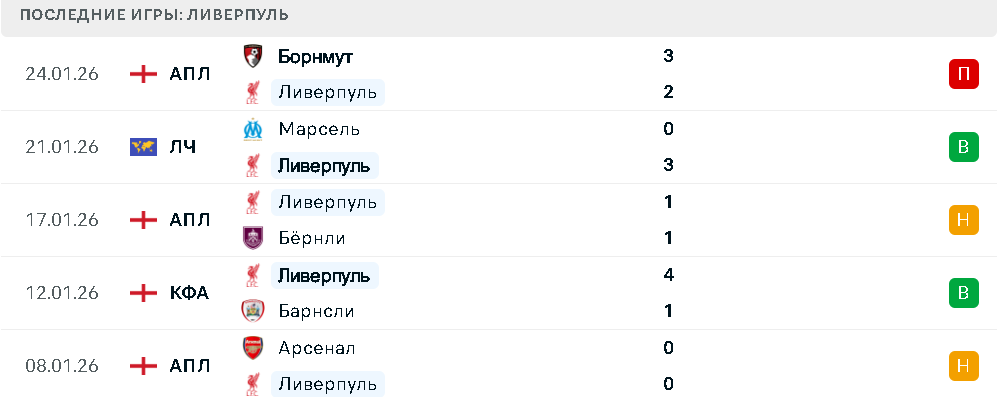 Поражение от «Борнмута» стало единственным для «Ливерпуля» за последние пять матчей во всех турнирах. Ранее команда уверенно обыграла «Барнсли» и «Марсель», а также разошлась миром с «Арсеналом» и «Бернли». В целом форма «красных» остаётся нестабильной, несмотря на положительные результаты.
