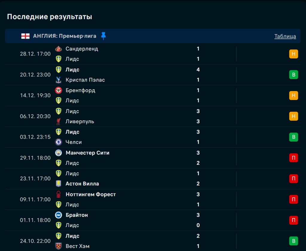 Последние 10 очных матчей: 6 побед «Ливерпуля», 3 ничьи, 1 победа «Лидса». В 8 из 10 — «обе забьют», в 9 из 10 — ТБ(2,5). Последняя встреча (6 декабря) завершилась 3:3, что подтверждает открытость противостояния. Средняя результативность — 4,6 гола за игру.