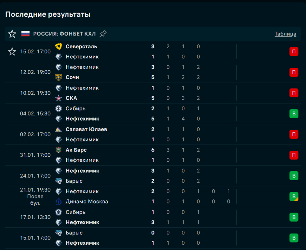 «Нефтехимик» идёт волной: в Новосибирске выиграли у «Сибири» 5:2 на реализации, но затем дома получили 1:5 от «СКА» и 3:5 от «Сочи», проваливаясь в своей зоне сериями. На выезде уступили «Северстали» 1:3, а с «Салаватом Юлаевым» проиграли 1:2, где не хватило моментов на камбэк.