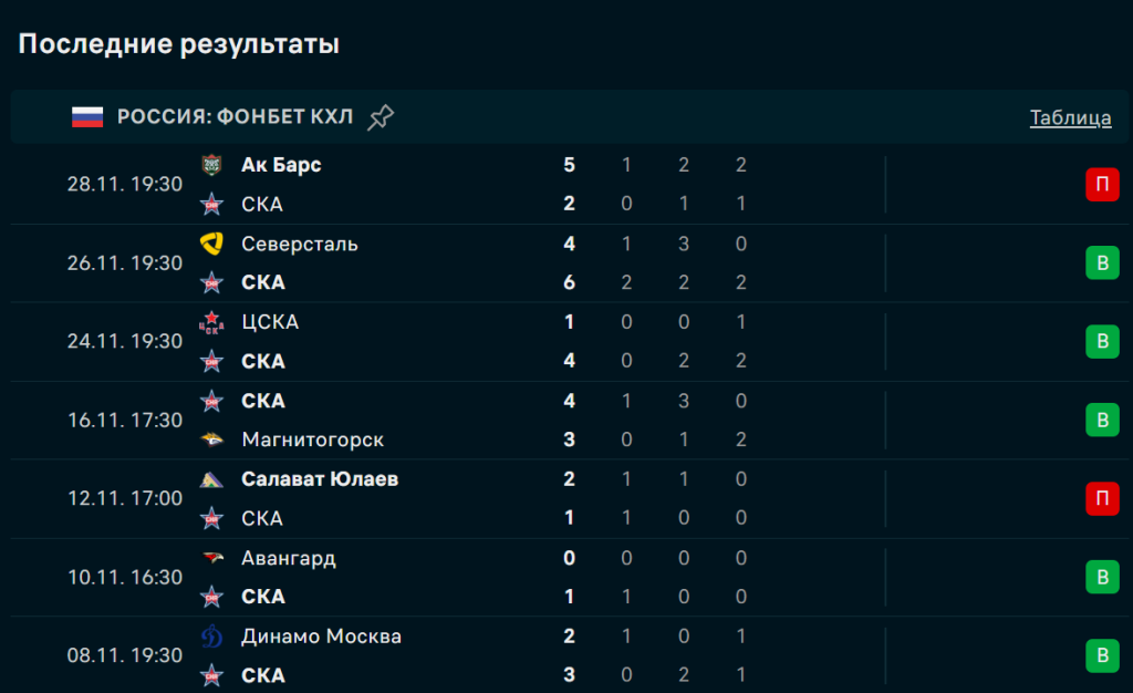 В последних пяти встречах СКА выиграл трижды и дважды проиграл. Победа над «Северсталью» с высокой результативностью, уверенный выездной успех против ЦСКА и победа над «Металлургом» в основное время. Даже в поражении от «Салавата» СКА демонстрировал контроль над шайбой и создавал моменты, что подчёркивает его потенциал в сложных условиях.
