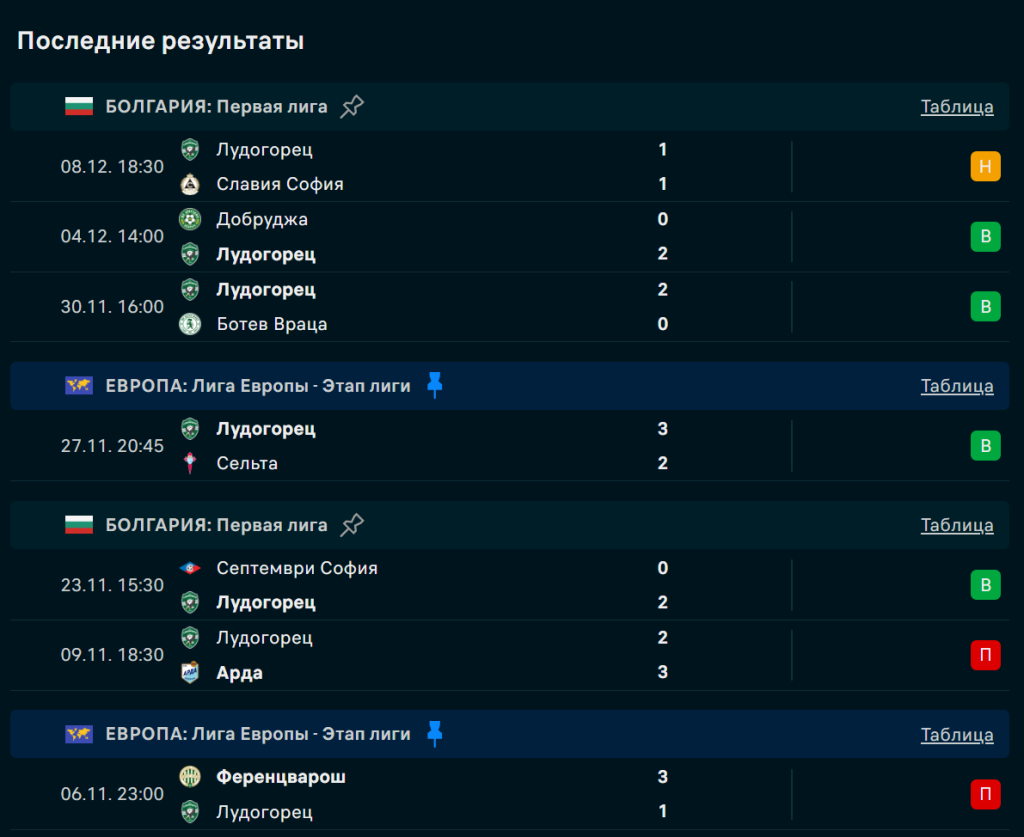 После трёх поражений подряд в ЛЕ (0:3 от «Лиона», 1:3 от «Сельты», 1:2 от «Маккаби») «Лудогорец» переломил ход: победа над «Сельтой» (3:2) в прошлом туре вернула шансы на плей-офф. Дома болгары сильны: 27 побед в 30 последних матчах во всех турнирах. Однако в ЛЕ на своём поле — нестабильность: 12 поражений в 15 последних домашних матчах турнира, включая крупные проигрыши.
