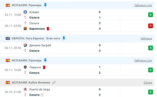 Последние игры Сельты