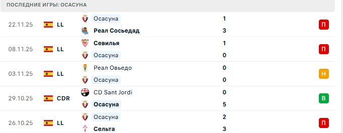 В ноябре команда продолжила серию без побед, потерпев поражение от «Реал Сосьедада» (1:3). Ранее были зафиксированы ничьи и поражения, причем в пяти последних турах команда не одержала ни одной победы. В атаке «Осасуна» выглядит безыдейно, забивая в среднем 0.5 гола за матч.