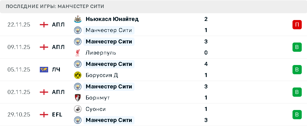 Поражение от «Ньюкасла» в последнем туре АПЛ стало для команды единственной неудачей в пяти предыдущих матчах. В остальных случаях «Манчестер Сити» одержал победы над «Суонси», «Борнмутом», дортмундской «Боруссией» и «Ливерпулем».