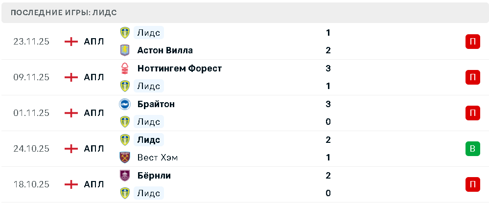 Единственное, чем может похвастаться «Лидс» за последнее время, — минимальная победа над «Вест Хэмом». В остальных случаях были поражения от «Бернли», «Брайтона», «Ноттингем Форест» и «Астон Виллы».