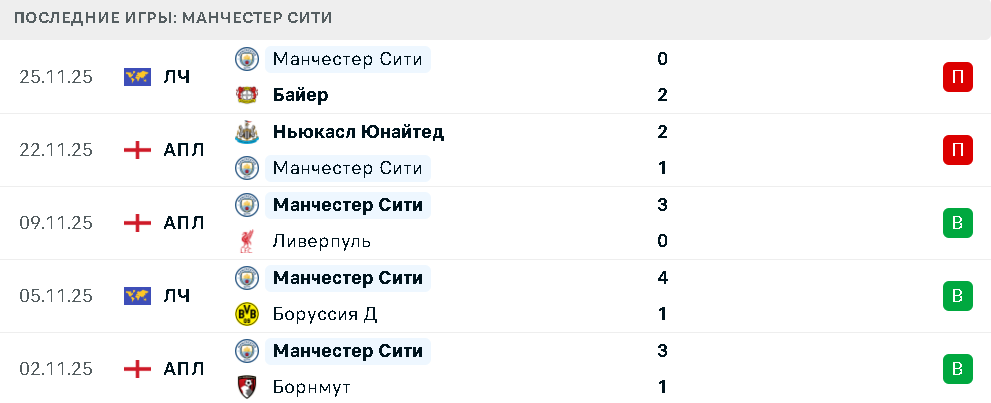 В двух последних матчах «горожане» потерпели поражения от «Ньюкасла» в АПЛ и дома в рамках Лиги чемпионов — от «Байера». Хотя до этого были уверенные победы над «Борнмутом», дортмундской «Боруссией» и «Ливерпулем».
