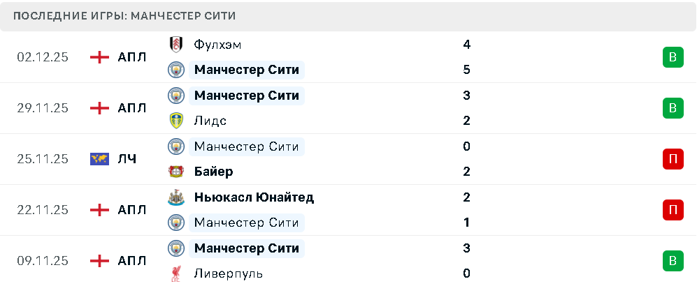 В предыдущих пяти матчах команда потерпела два поражения — от «Ньюкасла» и «Байера». В остальных встречах «горожане» одержали победы над «Ливерпулем», «Лидсом» и «Фулхэмом».