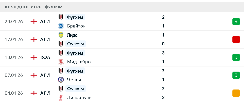 Поражение от «Лидса» остаётся единственным для «Фулхэма» в пяти последних матчах во всех турнирах. За этот отрезок команда одержала важные победы над «Челси», «Брайтоном» и «Мидлсбро» в Кубке Англии, а также сыграла вничью с «Ливерпулем», продемонстрировав высокий уровень организации игры.