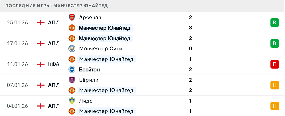 Отставка Аморима положительно сказалась на результатах команды. После ничьих с «Лидсом» и «Бернли» в чемпионате Англии, а также поражения от «Брайтона» в Кубке Англии, манкунианцы сумели прибавить. Победа в дерби над «Манчестер Сити» и трудовой успех в матче с «Арсеналом» подтвердили, что МЮ находится в отличной форме и готов бороться за место в Лиге чемпионов.