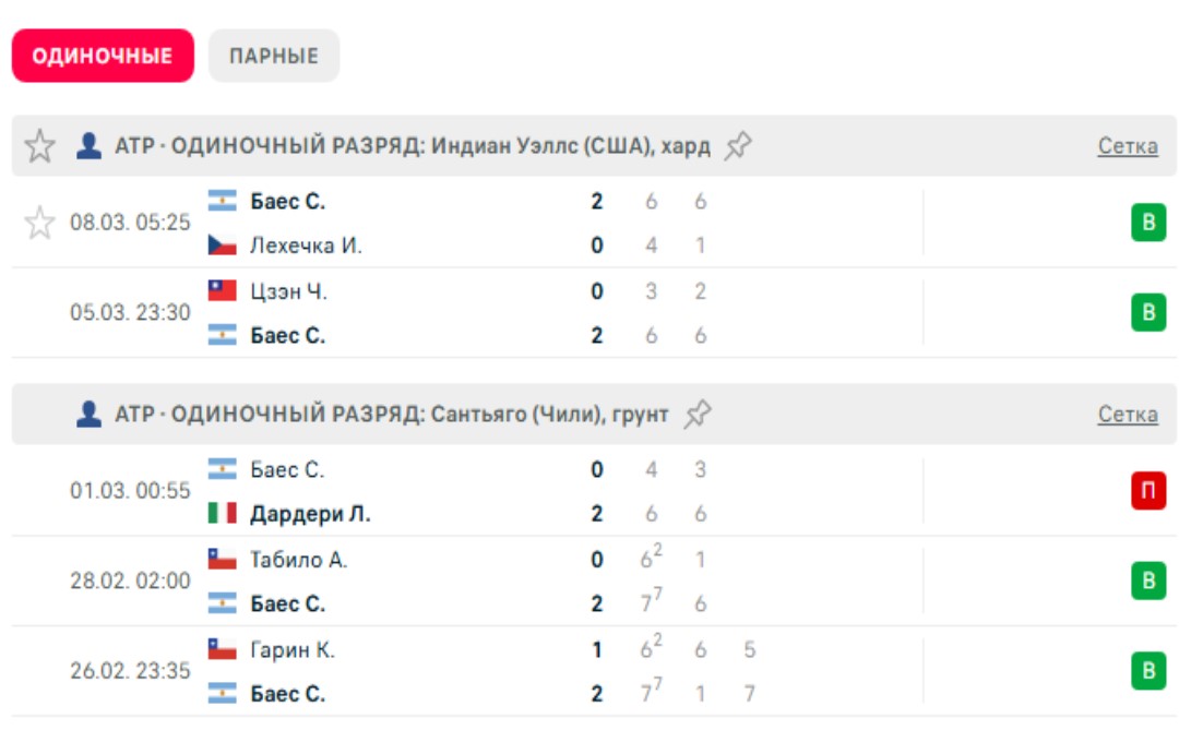 Баэс сейчас находится в хорошем игровом тонусе. Перед американским «тысячником» аргентинец продуктивно провел южноамериканскую серию — дошел до полуфиналов в Буэнос-Айресе и Сантьяго. Правда, выступал на этих турнирах на грунтовом покрытии. В Индиан-Уэллсе ему предстоит играть на харде.