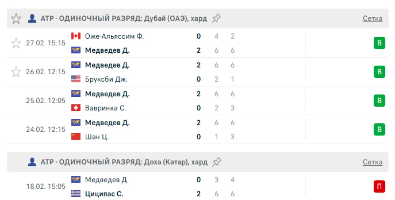 Соперники встречались между собой один раз в 1/4 финала турнира в Дубае в прошлом году. Медведев уступил 6:2, 6:7, 5:7.