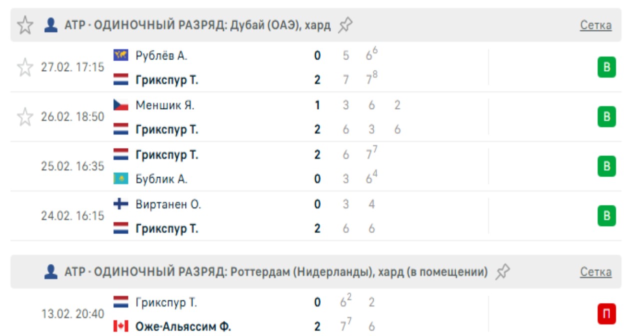 Грикспура в Дубае можно назвать главным разрушителем раскладов. Нидерландец проходит турнир на кураже, обыгрывая сеяных соперников и вытаскивая матчи в ключевые моменты, даже когда по ходу встречи возникают проблемы со здоровьем. Физическое состояние Грикспура вкупе с его психологической подготовкой не могут не впечатлять.