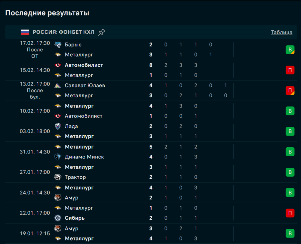 Последние игры Металлург Магнитогорск