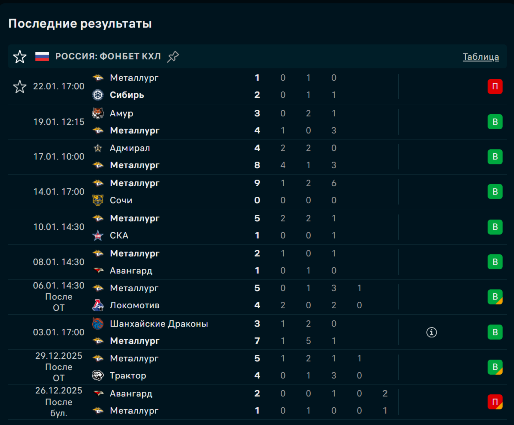 «Металлург» уверенно обыграл «Сочи» (9:0), СКА (5:1) и «Авангард» (2:1), затем разгромил «Адмирал» (8:4) и победил «Амур» (4:3). Единственное поражение в девяти матчах — от «Сибири» (1:2), но оно выглядит как тактическая осечка на фоне общей доминирующей формы. Серия подтверждает готовность команды к матчам с любым соперником.