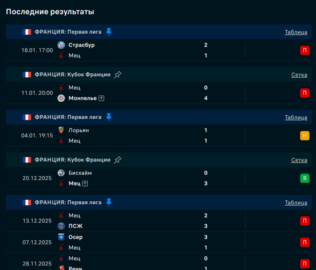 После ничьей с «Лорьяном» (1:1) и разгрома от «Монпелье» (0:4) стало ясно: «Мец» не способен выдержать даже умеренное давление. Проблема не только в мотивации, но и в тактике — при потере мяча команда теряет компактность. Даже победа над «Бишеимом» в Кубке не скрывает главного: в лиге «гранатовые» проигрывают почти всем, кроме самых слабых.