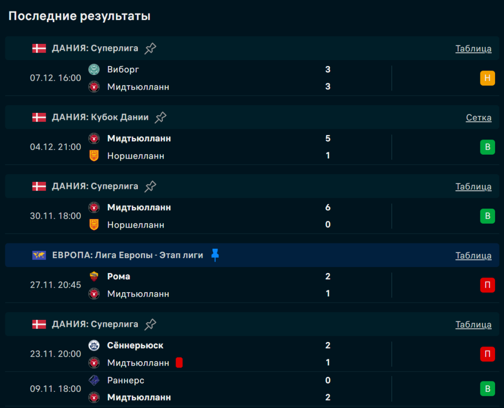 Последние игры Мидтьюлланн