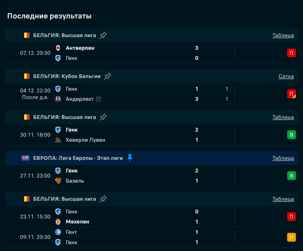 Последние игры Генк