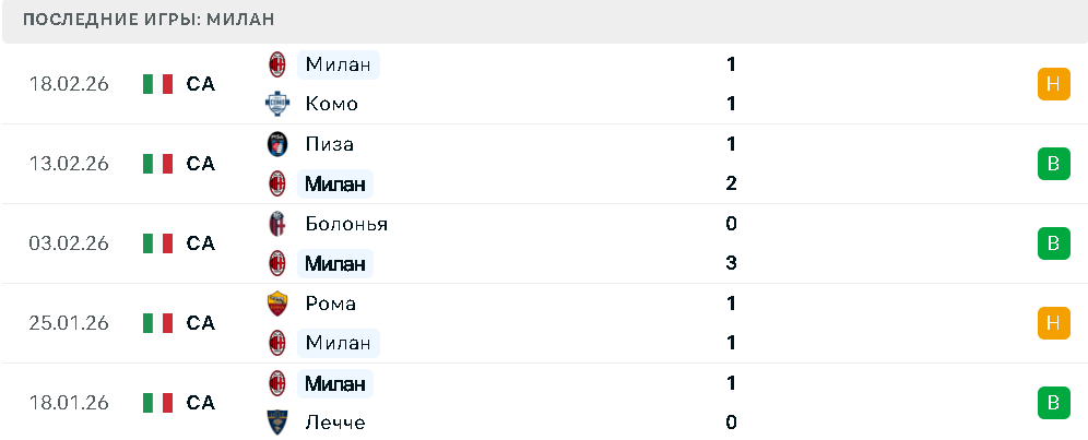 «Россонери» не проиграли ни одного из пяти последних матчей, однако дважды сыграли вничью — против «Ромы» и «Комо». Победы были одержаны над «Лечче», «Болоньей» и «Пизой». При этом только в двух из этих встреч миланцы сумели забить более одного мяча, что вновь указывает на осторожный стиль команды.