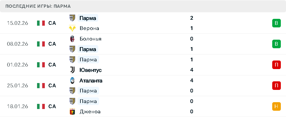 «Парма» постепенно стабилизировала результаты и уже два тура подряд не теряет очков. Благодаря этому отрыв от зоны вылета вырос до комфортных восьми баллов. Несмотря на достойную позицию в таблице, команда испытывает проблемы с результативностью — меньше забивает лишь один клуб лиги. При этом оборона выглядит достаточно организованной (18:31), позволяя «крестоносцам» набирать очки даже в непростых матчах. Главная ударная сила гостей — Пеллегрино, в активе которого 7 голов и 1 результативная передача. В гостях «Парма» действует прагматично: в пяти последних выездных встречах команда потерпела лишь одно поражение.