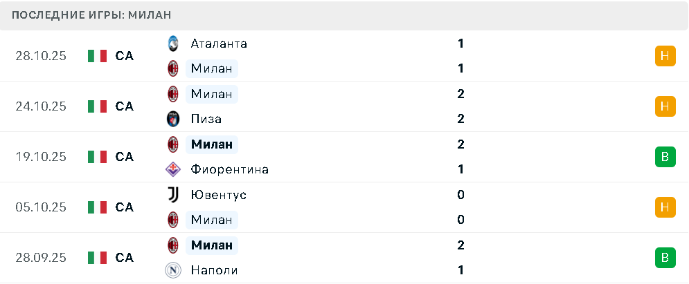 В пяти последних матчах Милан одержал только две победы над Наполи и Фиорентиной при трех ничьих с Ювентусом, Пизой и Аталантой.