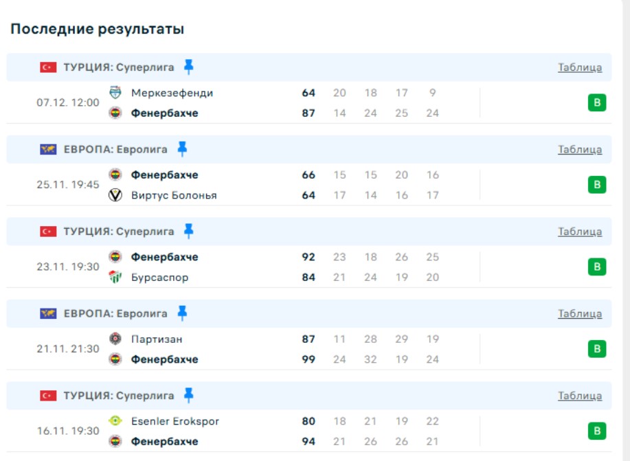 У Фенербахче серия из 10 побед во всех турнирах. В Евролиге команда литовского специалиста Шарунаса Ясикявичюса не знает поражений с конца октября — на протяжении 5 туров.