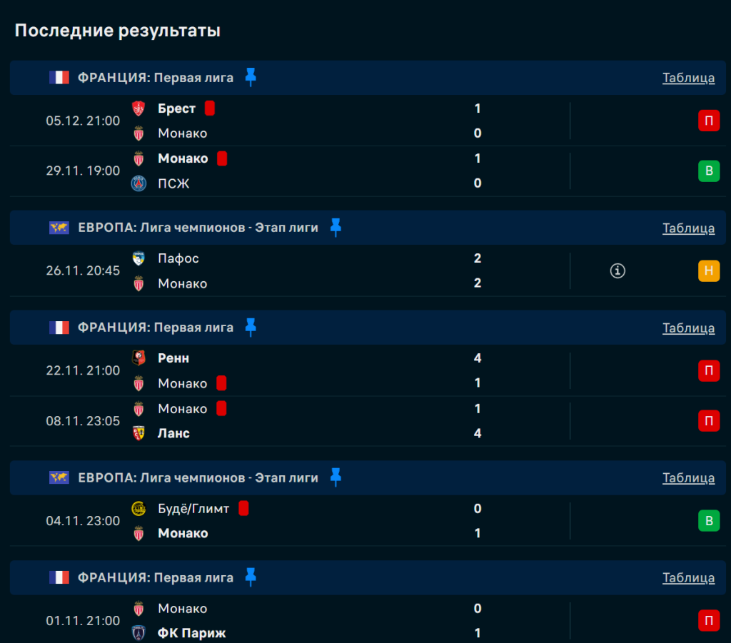 «Монако» демонстрирует нестабильную игру: 1 победа, 3 ничьи и 1 поражение на общем этапе ЛЧ. Команда Себастьена Поконьоли не побеждает дома в Лиге чемпионов с начала кампании, хотя ранее успешно выступала против турецких клубов на «Луи II» (4 победы в 5 матчах, минимум 3 гола за игру). Атака работает слабо — 1,2 гола в среднем за матч, а оборона пропускает 1,6. Балогун и Фати травмированы, что лишает хозяев главного оружия в завершении.
