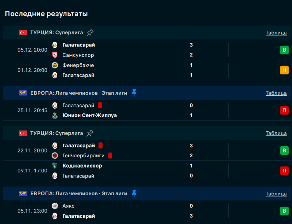 «Галатасарай» — лидер турецкой Суперлиги с 1 поражением в 15 турах. В ЛЧ турки выиграли 3 из 5 матчей, включая победы над «Ливерпулем» и «Ювентусом». Оборона надёжна: всего 2 пропущенных гола в последних 4 еврокубковых матчах. Осимхен в форме (11 голов в 14 играх), Сане и Гюндоган контролируют игру в центре поля. Однако на выезде в Европе — 7 поражений в 11 последних матчах.