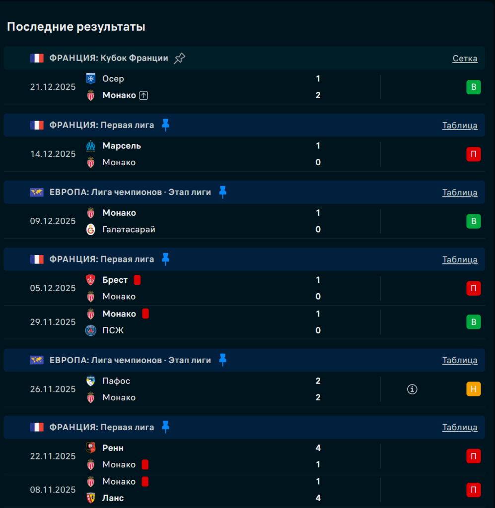 «Монако» выиграл у «Осера» (2:1), уступил «Марселю» (0:1) и «Бресту» (0:1), победил «Галатасарай» (1:0) и «ПСЖ» (1:0). В четырёх из пяти матчей проходил ТМ(2,5), в трёх — не более одного гола. Команда явно смещает акцент на оборону.