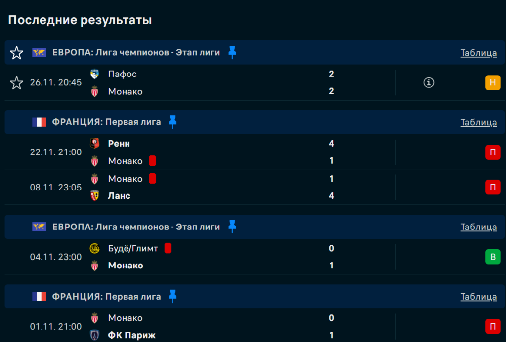 В последних матчах Монако терпел поражения: недавний домашний матч против «Ланса» завершился 1:4, ранее была осечка на выезде против «Ренна». Такая серия — тревожный сигнал, особенно перед игрой с сильным соперником. И даже несмотря на моменты в атаке, защитные «дыры» команды остаются серьёзным недостатком. Только одна победа в пяти матчах — неуверенность, низкий моральный настрой.