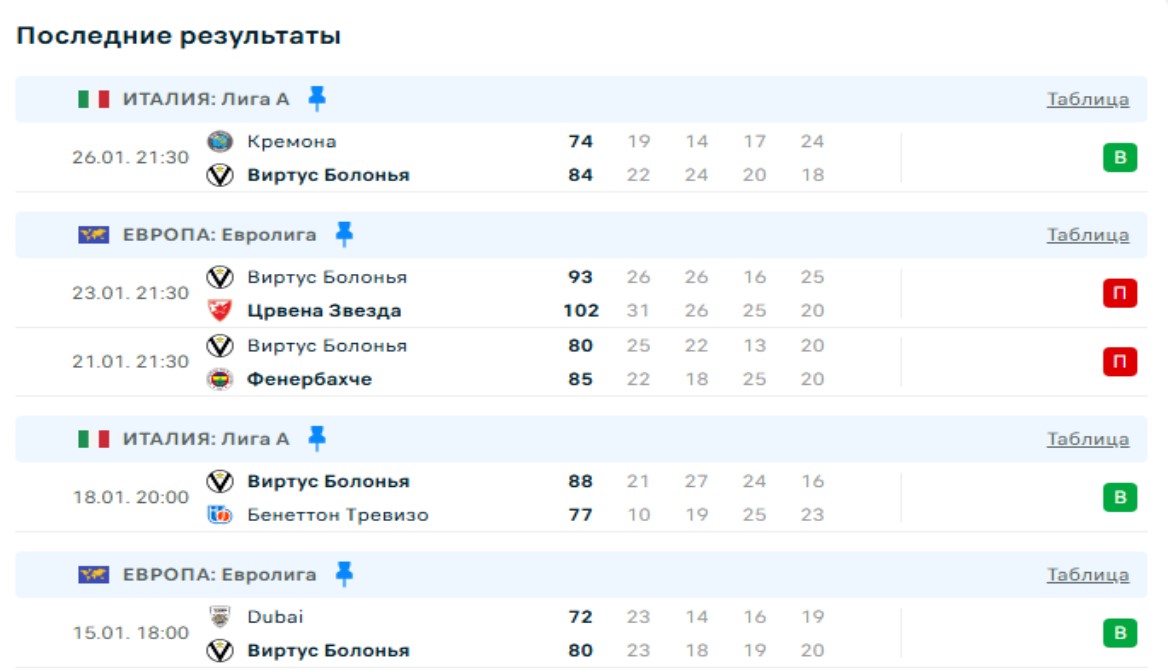 В первом круге «Виртус Болонья» победила дома 77:73. До этого три победы подряд в очных встречах на стороне монегасков. При этом французы не слишком уверенно играют против баскетболистов из Болоньи дома — в пяти матчах одержано только две победы.