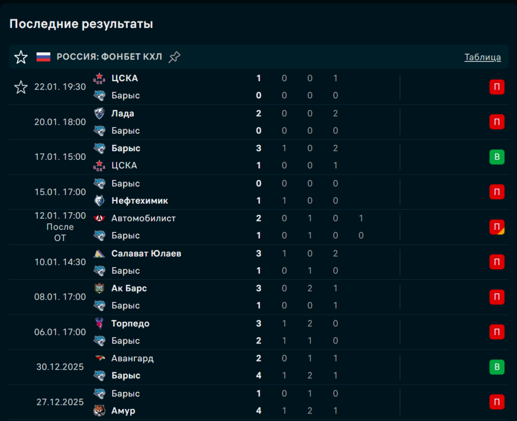«Барыс» уступил «ЦСКА» (1:0), «Ладе» (2:0), «Нефтехимику» (0:1), «Автомобилисту» (1:2 ОТ), «Салавату» (1:3) и «Торпедо» (2:3), прервав серию лишь победой над ЦСКА (3:1). Несмотря на отдельные всплески, команда не может обеспечить стабильность и регулярно проигрывает в ключевых эпизодах.