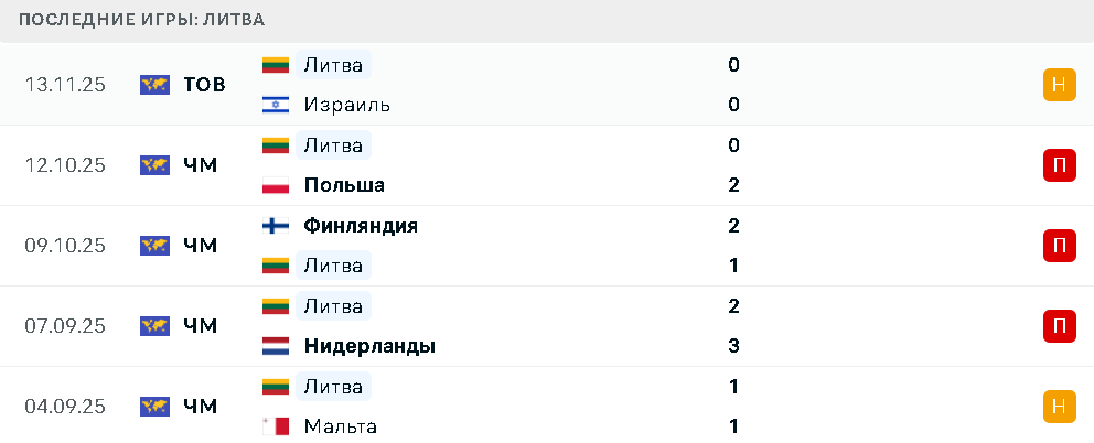 Литовцы в пяти последних матчах заработала два очка благодаря ничьим с Израилем и Мальтой. Между этими матчами Литва проиграла Нидерландам, Финляндии и Польше.