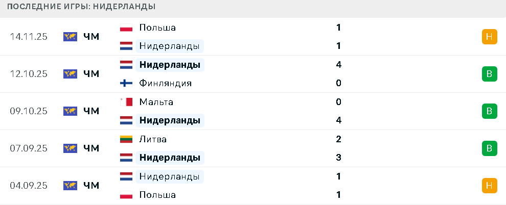 В пяти последних матчах нидерландцы дважды сыграли вничью с поляками. Между этими матчами были победы над Литвой, Мальтой и Финляндией.