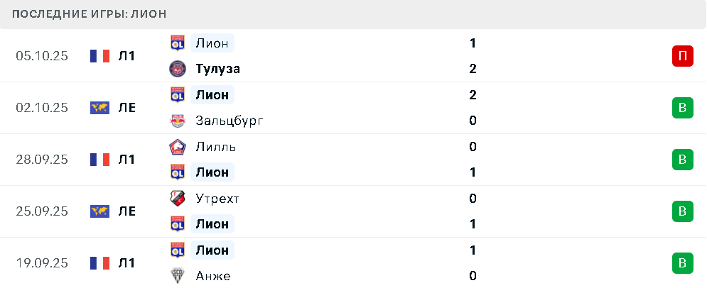 Лион в пяти последних очных матчах в разных турнирах одержал победы над Анже, Утрехтом, Лиллем и Зальцбургом. Также было поражение от Тулузы.