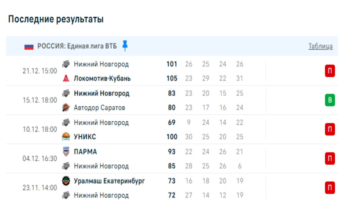 У нижегородцев 1 победа в предыдущих 6 матчах Единой лиги ВТБ. Подопечные Сергея Козина добились успеха в начале предыдущей недели в поединке против еще одного андердога — занимающего предпоследнее место Автодора. Игра получилась упорной Нижний Новгород выиграл с небольшим преимуществом 83:80.