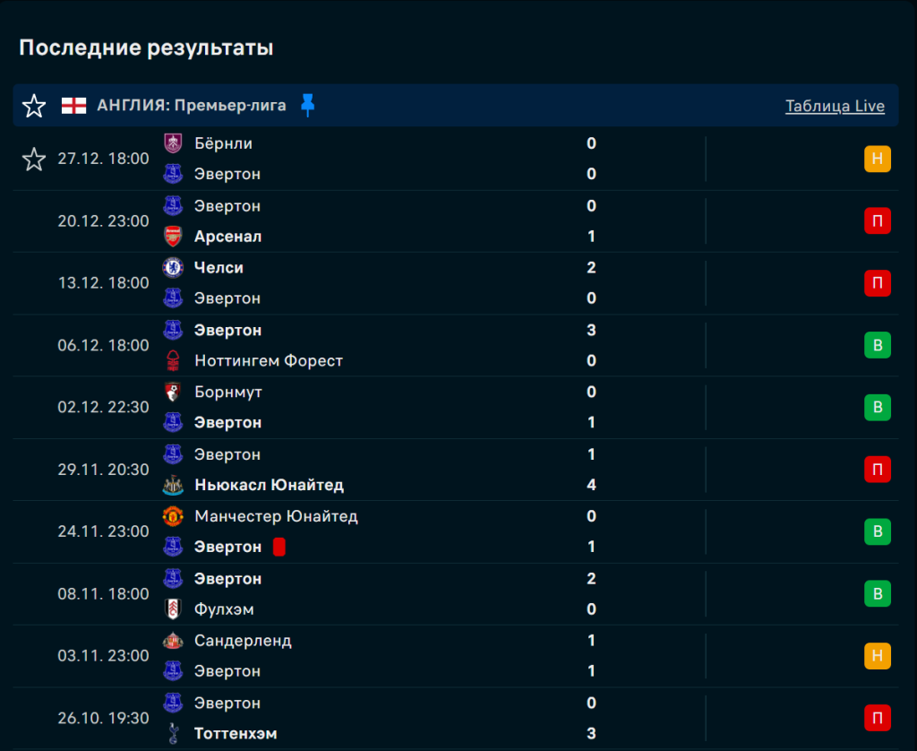 Последние игры Эвертон