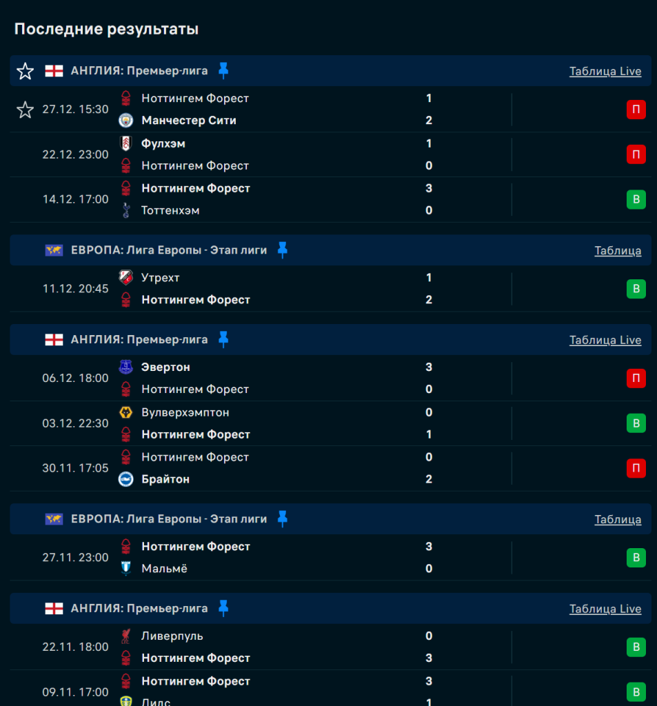 Команда Шона Дайча стала более организованной, но сохраняет низкую реализацию: 18 голов — худший показатель среди неаутсайдеров. Дома «Форест» выиграл 3 из 9 матчей, но в 5 из последних 6 домашних встреч проходил тотал меньше 2.5. Оборона стабильна при владении, но уязвима в быстрых контратаках. Отсутствие Сангаре и Айны ослабляет центр поля и фланги.