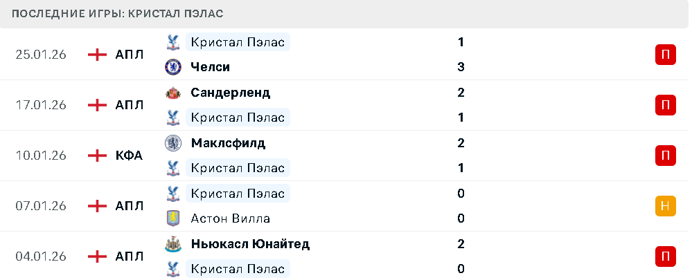 «Кристал Пэлас», напротив, переживает затяжной кризис. В пяти последних матчах лондонцы набрали всего два очка, причем оба — в домашних встречах. Эта неудачная серия фактически перечеркнула еврокубковые амбиции клуба и заставляет его всерьез задуматься о борьбе за выживание. С результативностью у команды есть проблемы, хотя оборона остается одной из лучших среди клубов нижней части таблицы (24:28). Ранее «орлы» стабильно набирали очки в гостях, однако в трех последних выездных матчах АПЛ не смогли заработать ни одного балла.