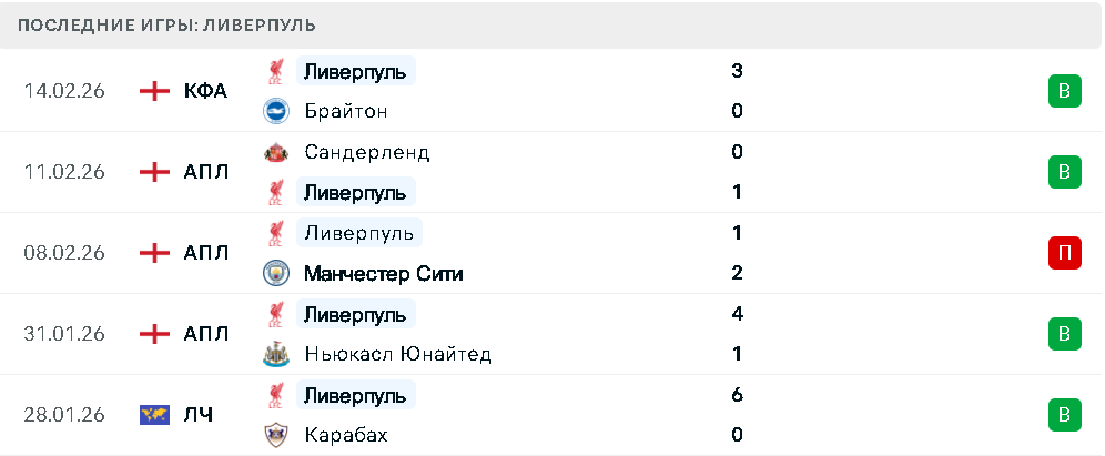 Единственным неудачным матчем за аналогичный период стало поражение от «Манчестер Сити». В остальных встречах «красные» обыграли «Карабах», «Ньюкасл», «Сандерленд» и «Брайтон», продемонстрировав высокий атакующий потенциал. Однако стабильности по-прежнему не хватает.