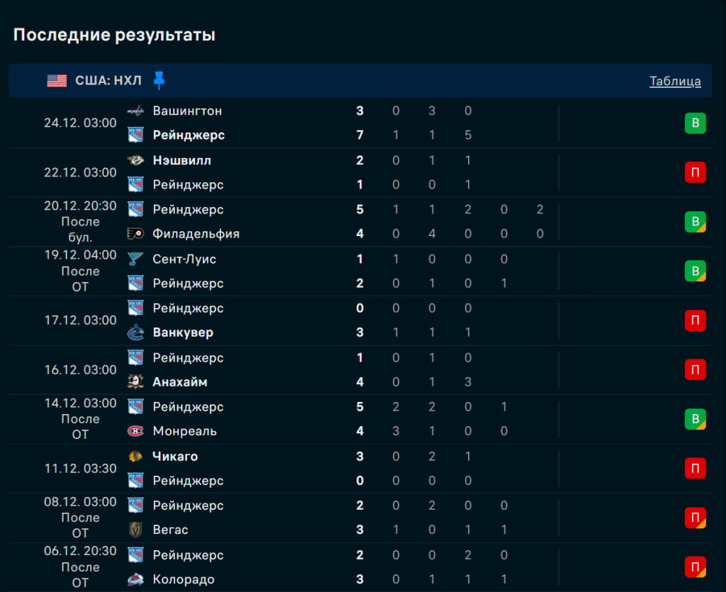 Гости демонстрируют контрастную форму: победа 7:3 над «Вашингтоном», но в 7 из 10 предыдущих матчей — ТМ(5.5). Реализация — 9,8 % (один из худших показателей лиги). Панарин сместил акцент на броски (42 за 9 матчей), но команда зависит от ключевых моментов. На выезде «Рейнджерс» выигрывают 72 % матчей, но редко забрасывают 3+ шайб. Отсутствие Фокса и Миллера ослабляет оборону и игру в большинстве.