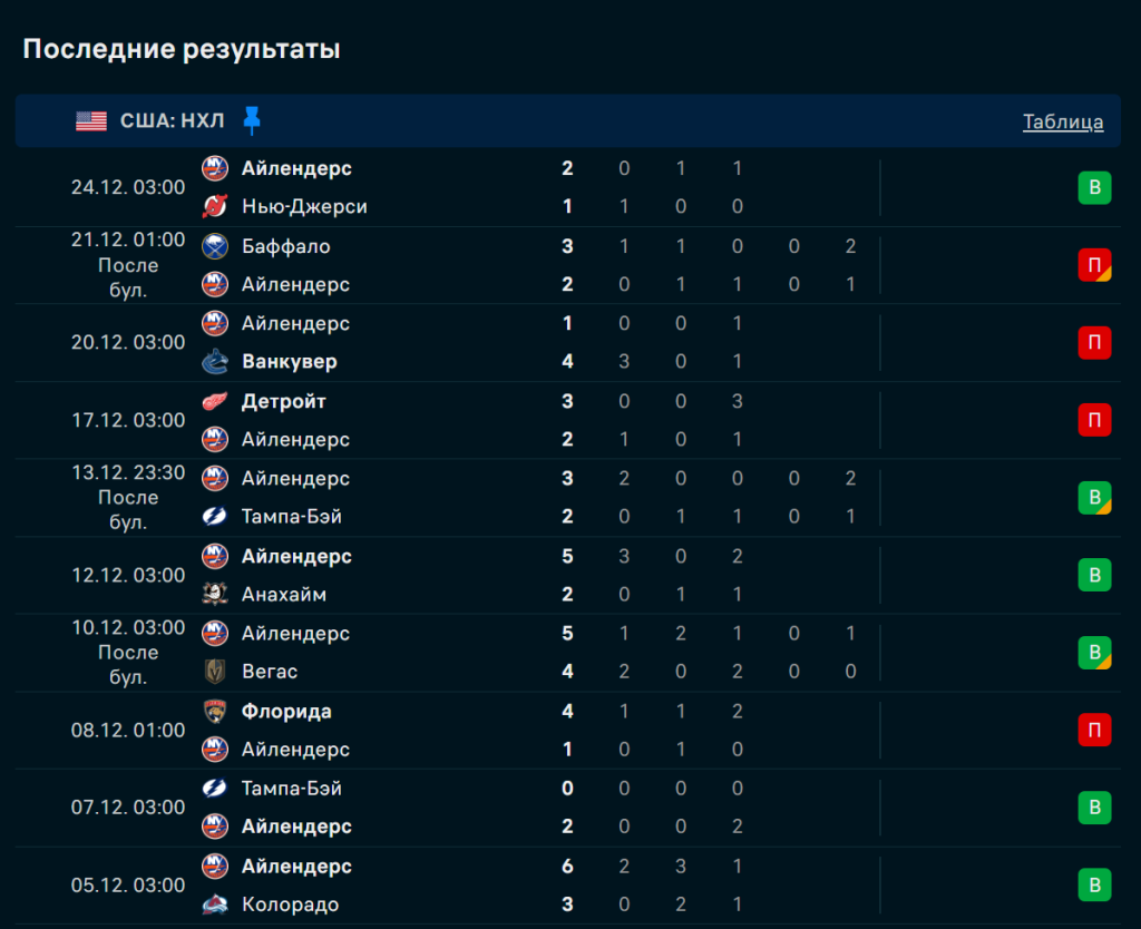 8 ноября «Айлендерс» выиграли (5:0), но до этого в 4 из 5 встреч обе команды забивали. Средняя результативность за последние 5 матчей — 5,2 шайбы. В 5 из 7 очных встреч проходил ТМ(5.5).