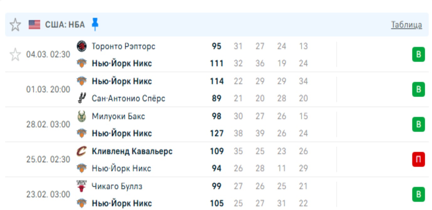 Последние игры Нью-Йорк Никс
