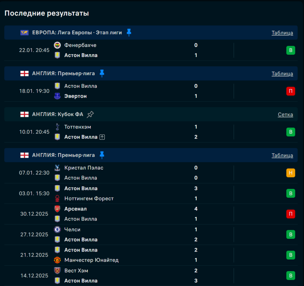 Последние игры Астон Вилла