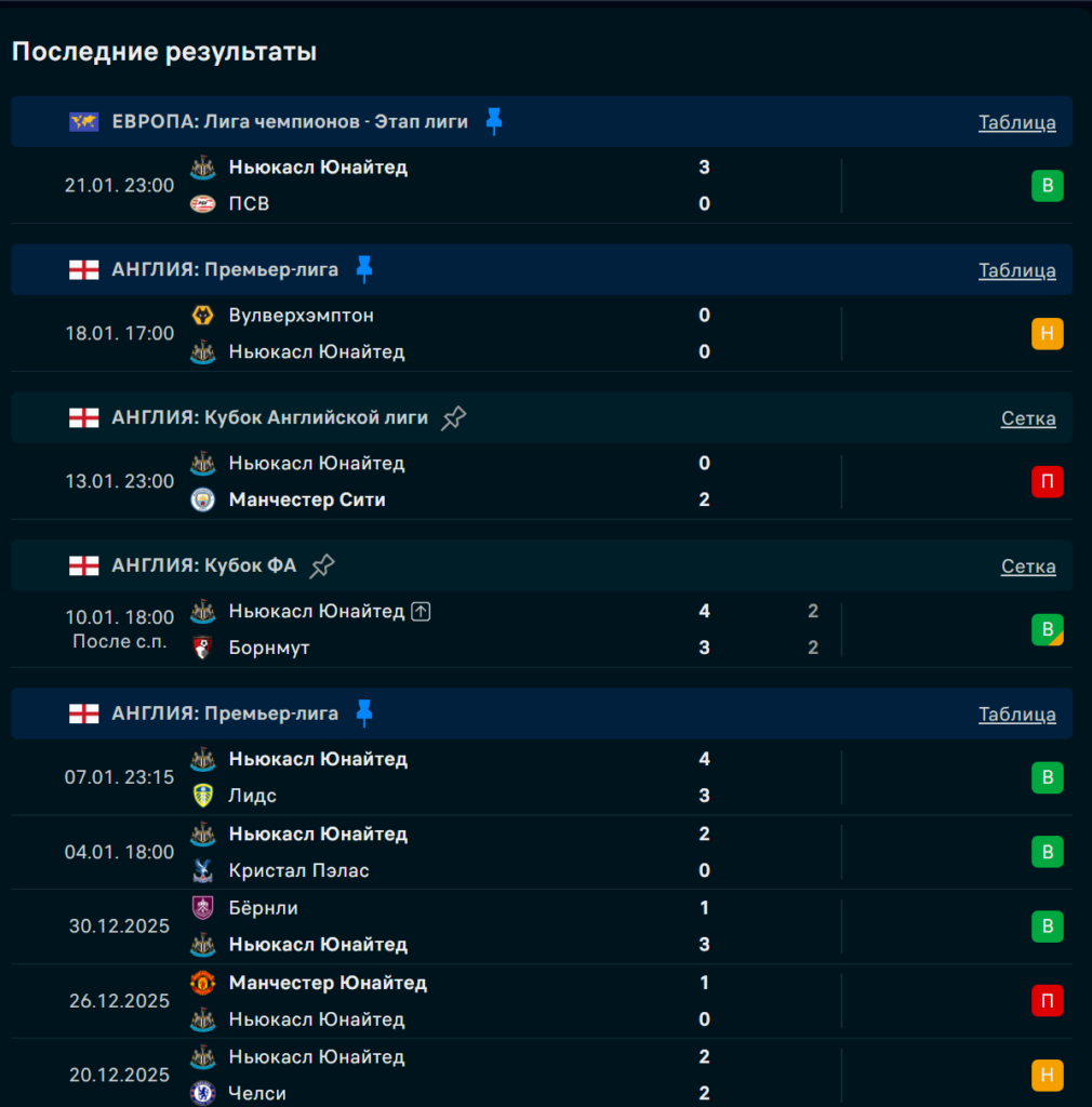 Последние игры Ньюкасл