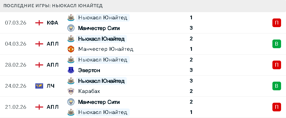 В пяти последних матчах во всех турнирах «сороки» демонстрировали нестабильные результаты. Команда сумела одержать важные победы над «Карабахом» и «Манчестер Юнайтед», показав характер и эффективность в атаке. Однако в остальных встречах «Ньюкасл» потерпел поражения от «Манчестер Сити», «Эвертона» и вновь «Манчестер Сити» в рамках Кубка Англии. Такая серия результатов подчеркивает проблемы команды в матчах против соперников высокого уровня.