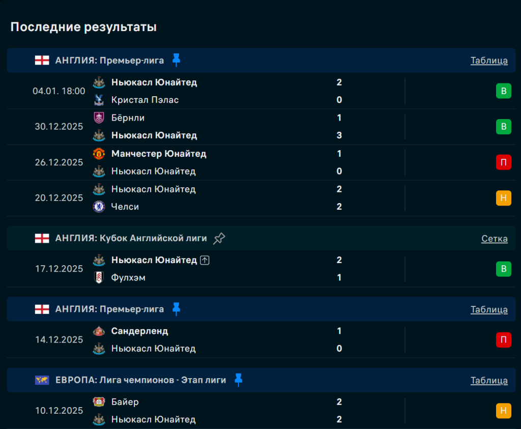 Последние игры Ньюкасл
