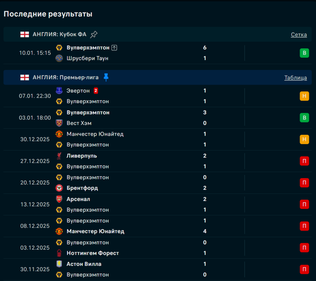 Команда демонстрирует признаки стабилизации после смены тренера. За последние три матча набрано 5 очков, забито 5 голов, пропущено 2. xG указывает на недооценённую реализацию: в сезоне забито 15 голов при ожидаемых 21,3. Дома «Вулверхэмптон» остаётся уязвимым (пропущено 23 гола в 10 матчах), но в последних играх улучшил организацию обороны. Главная угроза — контратаки через Мане и Ларсена, особенно на фоне проблем гостей в защите.