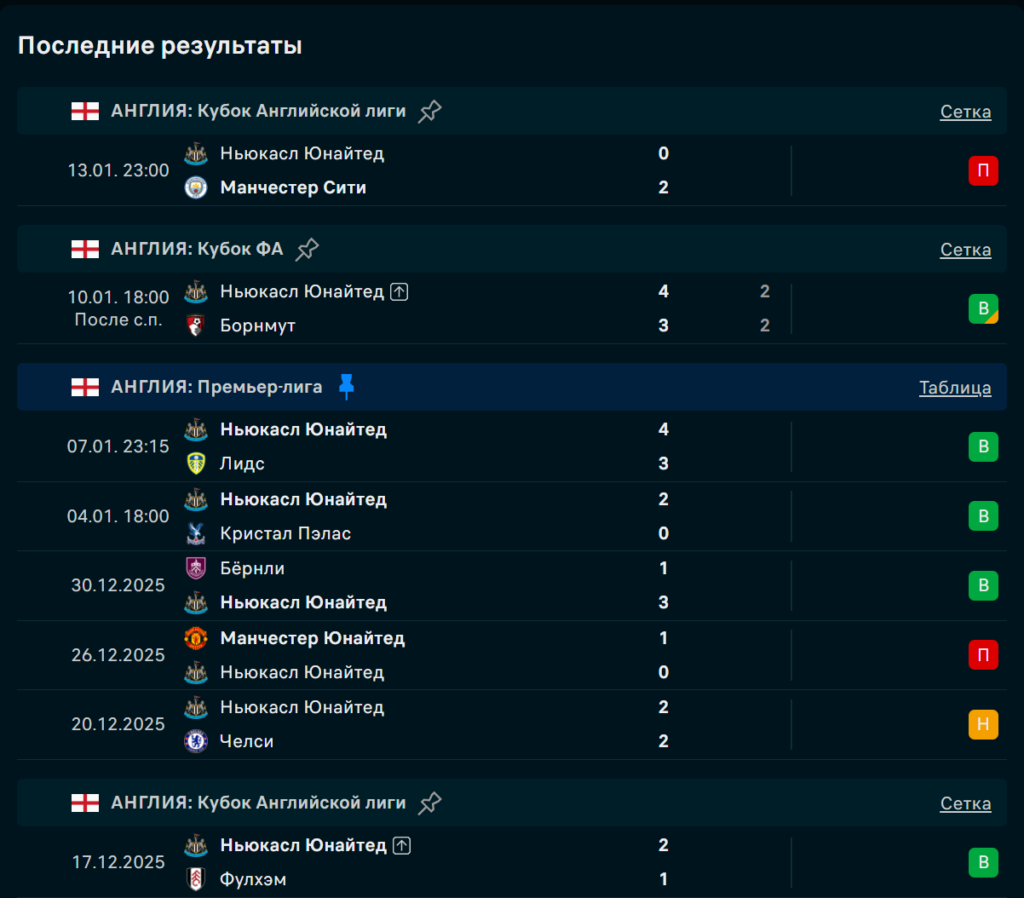«Ньюкасл» победил «Бернли» (3:1), «Кристал Пэлас» (2:0) и «Лидс» (4:3), но уступил «Ман Сити» (0:2) и сыграл вничью с «Борнмутом» (3:3). В четырёх из пяти последних матчей проходил тотал больше 2,5 голов. Атака эффективна, но оборона нестабильна, особенно без лидеров.