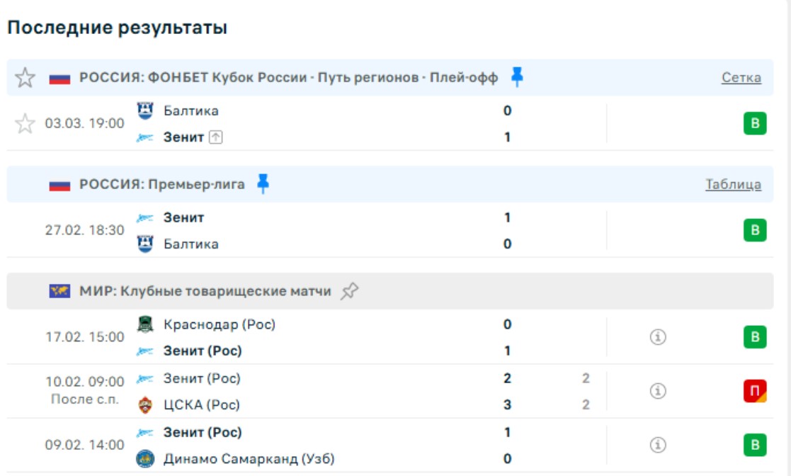 Последние игры Зенита