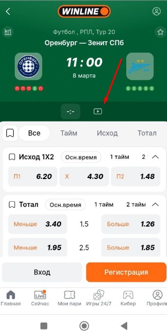 Зарегистрированные игроки БК могут смотреть игру на сайтах и в приложениях беттинговых компаний. В «Винлайн» просмотр видеопотока доступен после авторизации или создания профиля. Достаточно зайти на страницу события и нажать на Play.